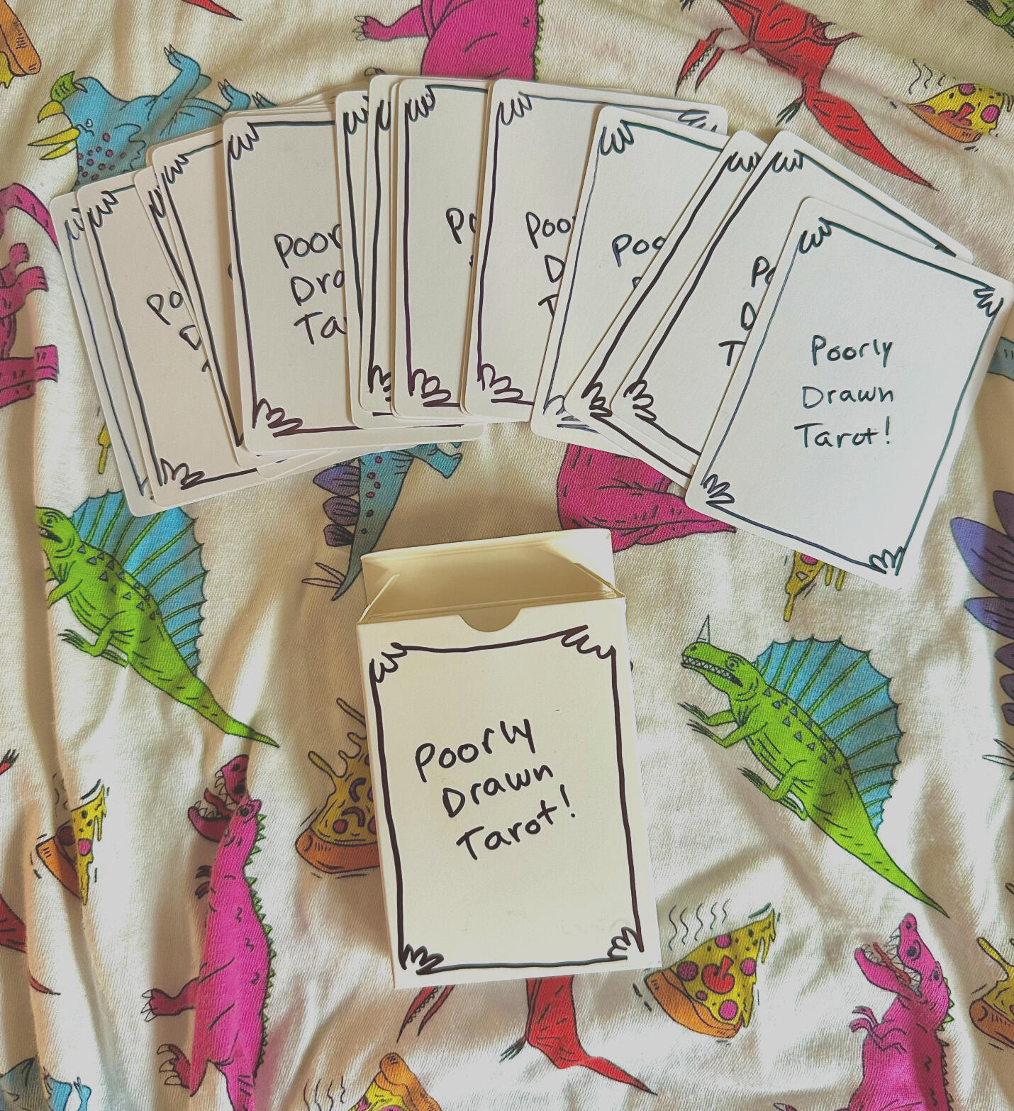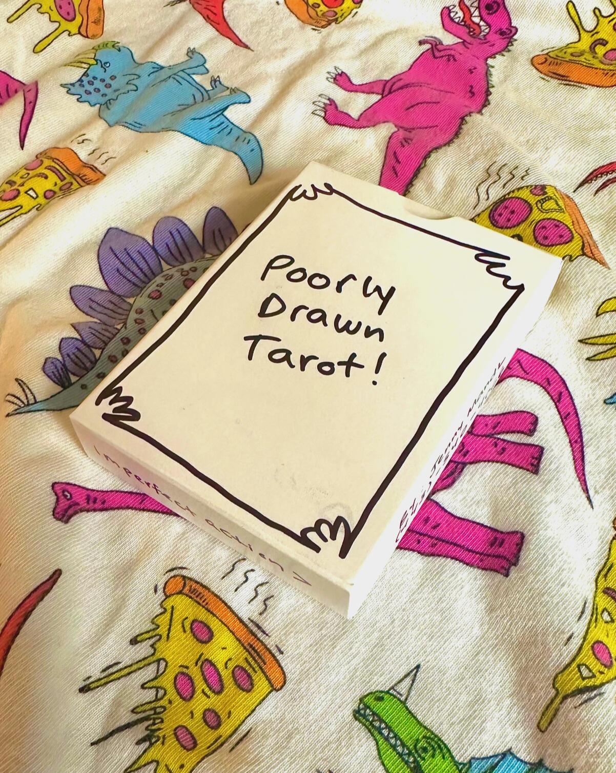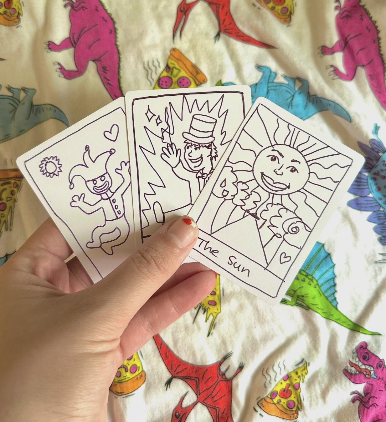 tarot is a deck of illustrated cards where each picture invites a different energy and perspective. It comes with a little guide book that describes what each card represents. there are so many ways to use the deck! you can ask a question or have fun exploring someone's future and past through a new lens. it's a fun way to connect deeply and playfully and also to think about life in new ways.