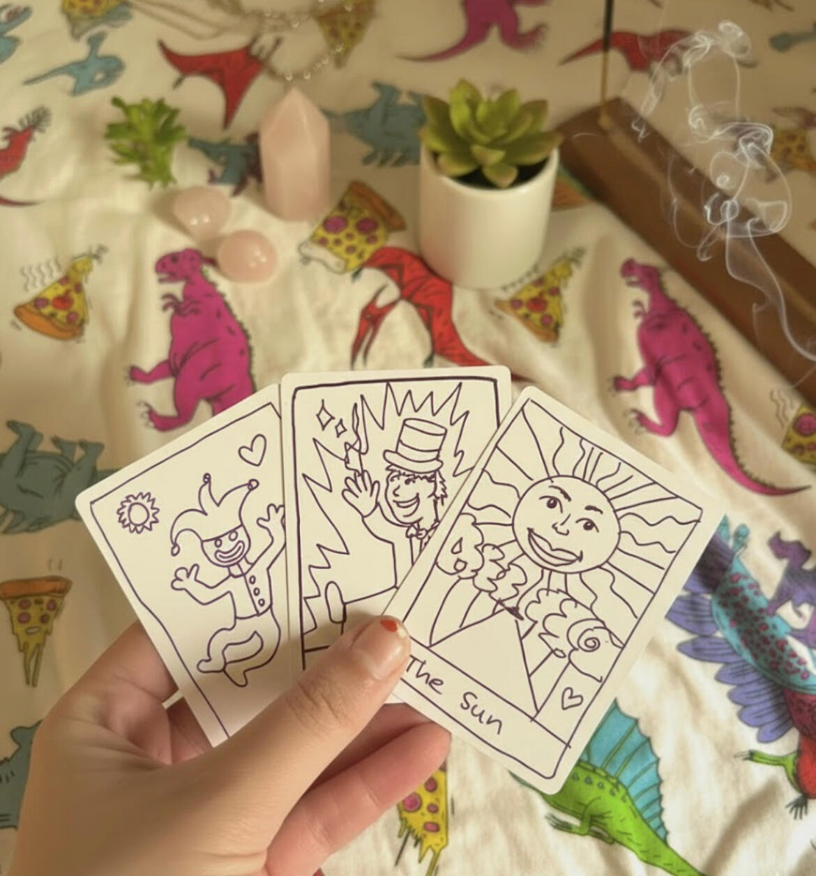 tarot is a deck of illustrated cards where each picture invites a different energy and perspective. It comes with a little guide book that describes what each card represents. there are so many ways to use the deck! you can ask a question or have fun exploring someone's future and past through a new lens. it's a fun way to connect with others deeply and playfully and also to think about life in new ways.